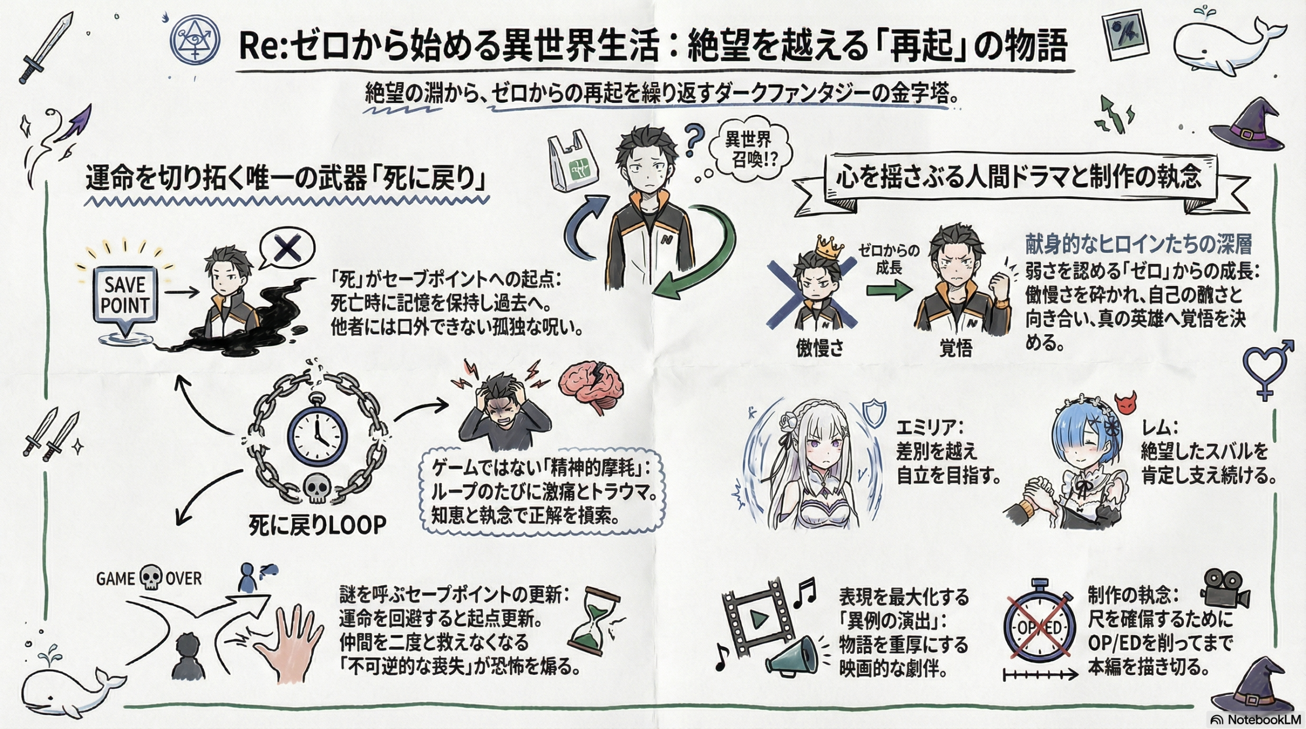 『リゼロ』を語るうえで外せないのが、スバルの能力である「死に戻り」です。今回の動画でも中心に置かれていたのはこの点で、死亡すると記憶を保ったまま特定の地点へ巻き戻される、という設定が作品全体の土台になっています。
