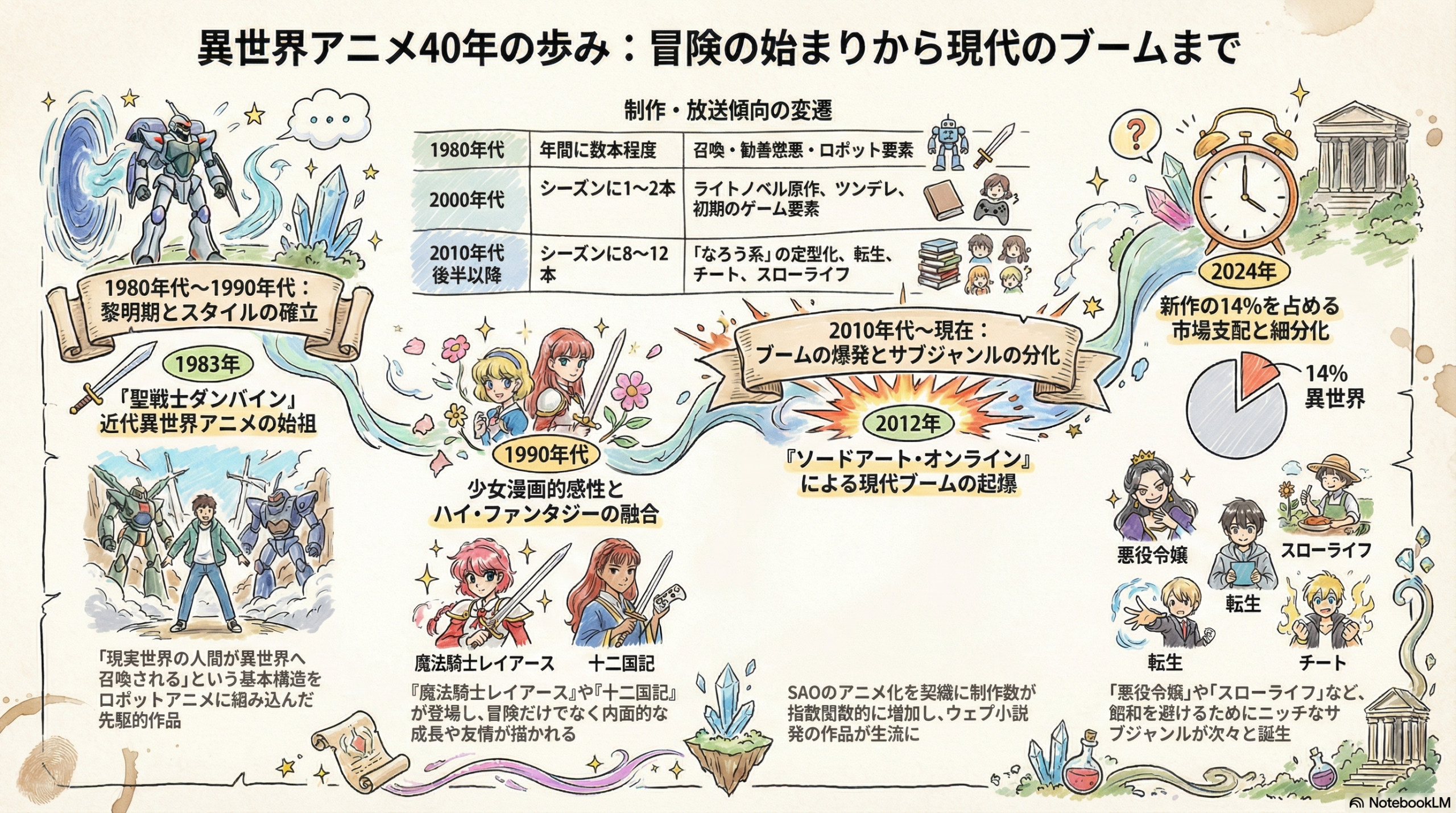 ご主人様の資料を紐解きますと、異世界アニメの歴史は40年以上も前から積み上げられてきたことがわかります。 それぞれの時代の流行や特徴を、順を追って整理していきましょう。
